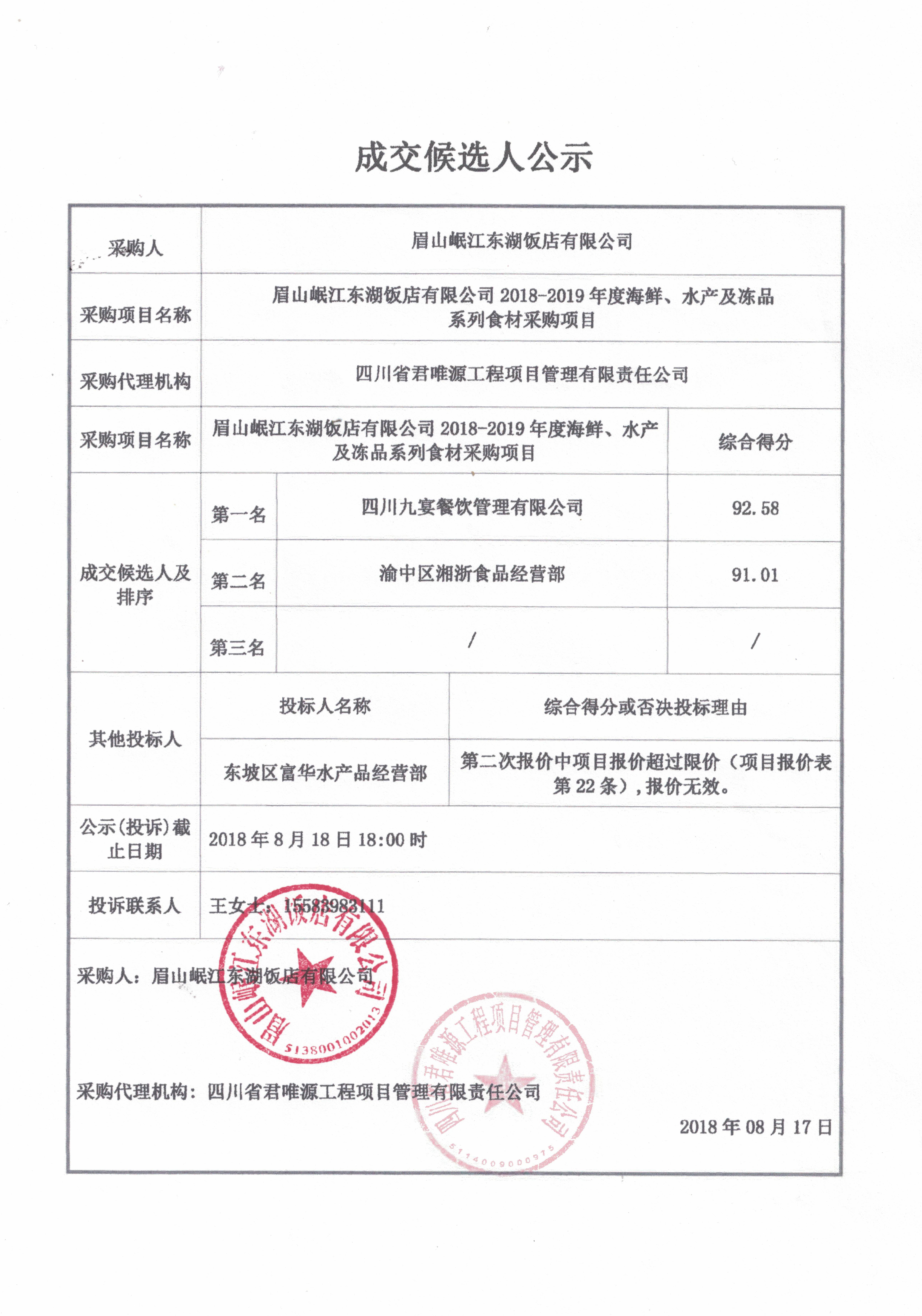 2018-2019年度海鮮、水產(chǎn)及凍品系列食材采購項目成交候選人公示
