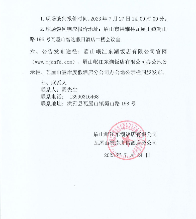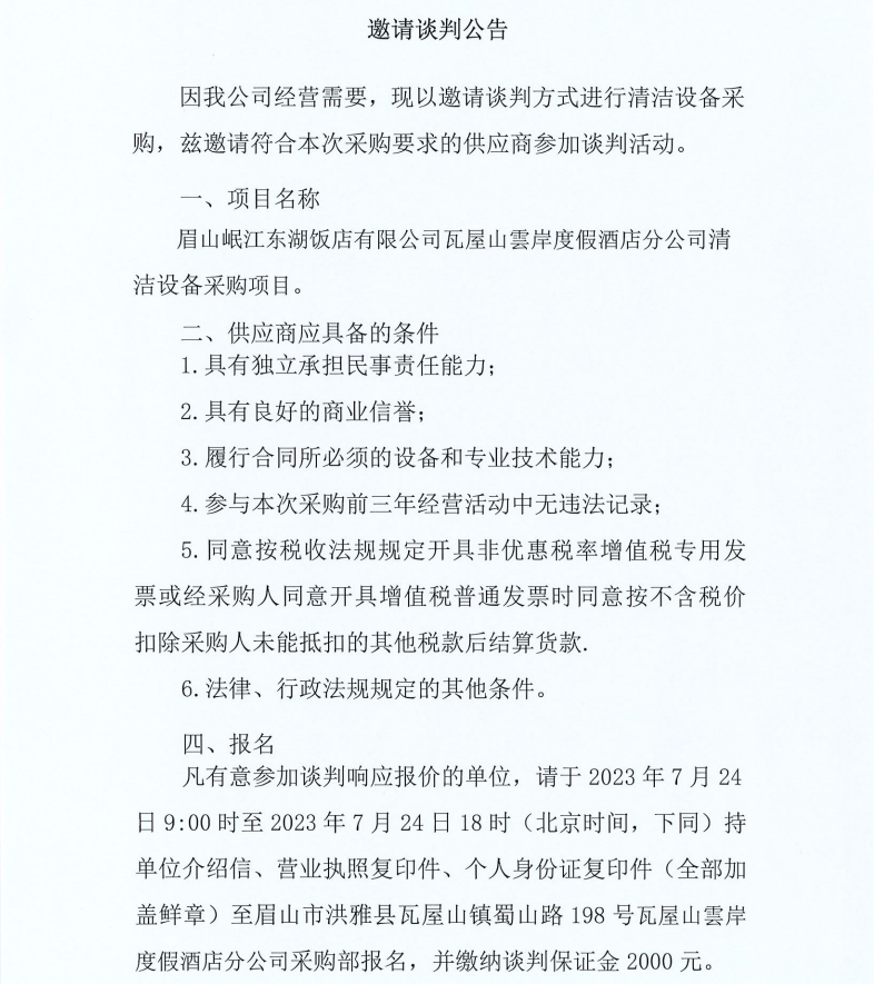 眉山岷江東湖飯店有限公司瓦屋山雲(yún)岸度假酒店分公司清潔設(shè)備采購(gòu)項(xiàng)目